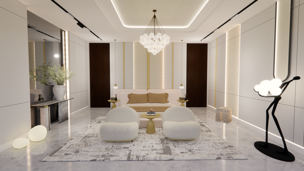 At the center, the low-profile upholstered bed enhances the room’s minimalist elegance, complemented by plush lounge chairs that introduce comfort and a sculptural quality. The use of layered lighting from the statement chandelier to the concealed cove lights and sleek vertical strips adds a warm ambient glow, highlighting textures and elevating the overall mood.